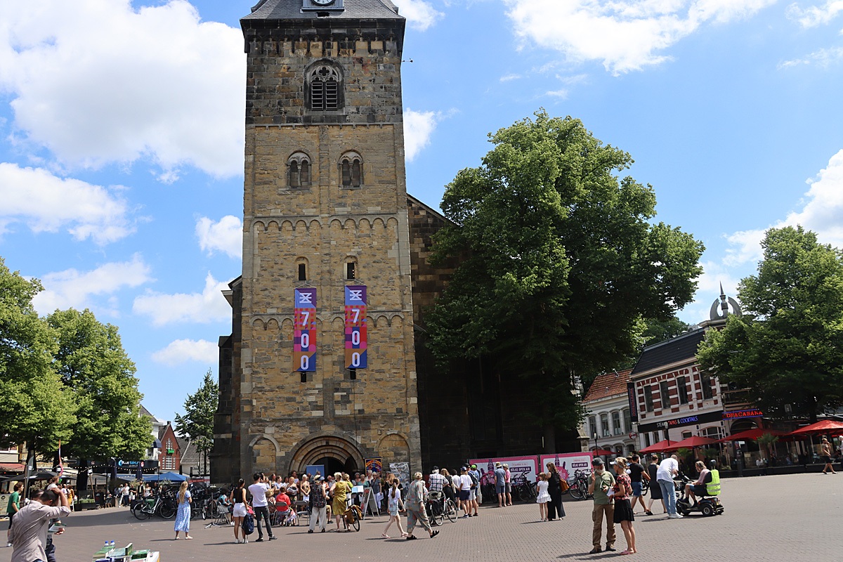 Welkom allemaal daar beneden! Voor diegenen die dat nog niet weten: ik zit boven, in het dak van de toren van de Grote Kerk. Vandaag kun je me ook zien op het beeldscherm op de Oude Markt Dit is het derde concert in het kader van Enschede#700, waarvoor we liedjes verzamelen uit het geboorteland van de inwoners van Enschede.