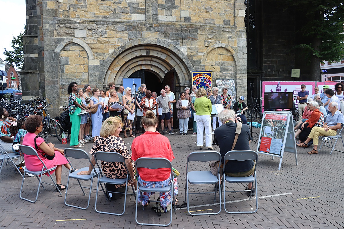 De zangers van IntervOcaal zongen vijf liedjes mee op het marktplein, terwijl twee solozangers uit het koor hun bijdrage uit Brazilië en Sierra Leone vanuit de toren met de beiaardier meezongen. Zij stonden bij de stadsbeiaardier in haar speelcabine in de spits van de toren.